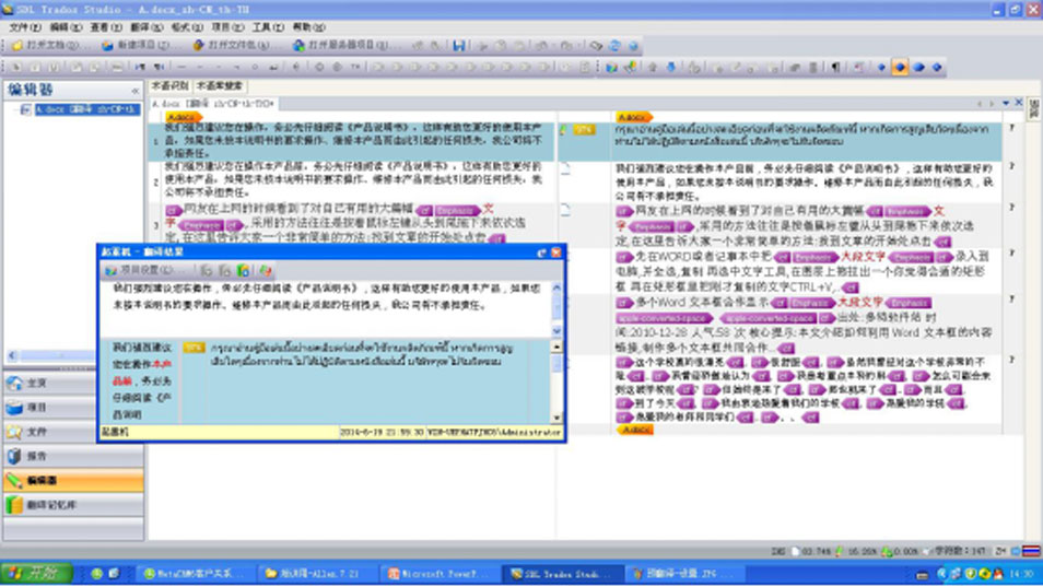 為解決多名譯員同時翻譯術語及風格一致性的問題,以及相同部分無需再次翻譯的問題,我們采用當前流行的Trados輔助翻譯系統,可讓多名譯員共享翻譯記憶庫(TM),有效提高譯文的準確性和一致性,并可實現成本節約、效率提高。